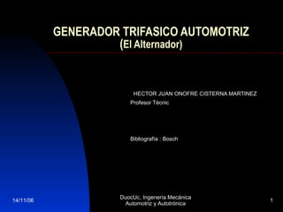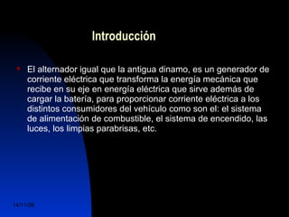 El documento describe el funcionamiento de un alternador trifásico automotriz. Explica que el alternador reemplazó a la dinamo debido a que puede generar corriente incluso a bajas revoluciones del motor y no tiene escobillas. Describe los componentes clave del alternador, incluido el rotor que crea el campo magnético, el estator con las bobinas que generan la corriente, y el puente rectificador de diodos que convierte la corriente alterna en continua para cargar la batería.