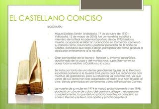 Este documento presenta un resumen biográfico y de la obra del escritor español Miguel Delibes. Delibes tuvo una exitosa carrera como novelista que plasmó la vida rural y la naturaleza de Castilla. Algunas de sus novelas más destacadas incluyen "La sombra del ciprés es alargada", "El camino", "Diario de un cazador" y "Mi idolatrado hijo Sisí". A lo largo de su obra, Delibes exploró temas como la infancia, Castilla, el campo, la caza,