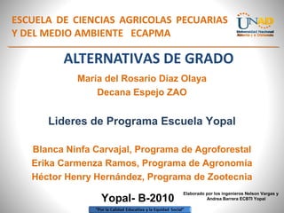 Este documento describe las diferentes alternativas de trabajo de grado disponibles para los estudiantes de la Escuela de Ciencias Agrícolas Pecuarias y del Medio Ambiente ECAPMA. Estas incluyen proyectos aplicados, proyectos de investigación, experiencia profesional dirigida, monografías y créditos de posgrado. Se explican los procedimientos y etapas para cada alternativa, así como las responsabilidades de los estudiantes, directores y jurados involucrados. El objetivo es ofrecer diversas opciones para que los estudiantes apliqu