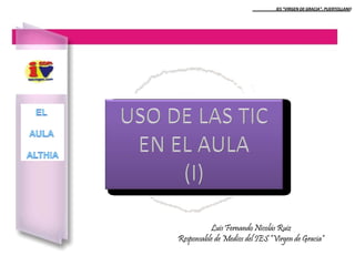 El documento describe el aula Althia, un aula equipada con recursos informáticos cuyo objetivo principal es el uso de las TIC como herramientas didácticas. Explica qué es y no es el aula Althia, cómo funcionan los diferentes dispositivos como la cámara y tarjeta de TV, y algunas direcciones de Internet con recursos educativos.