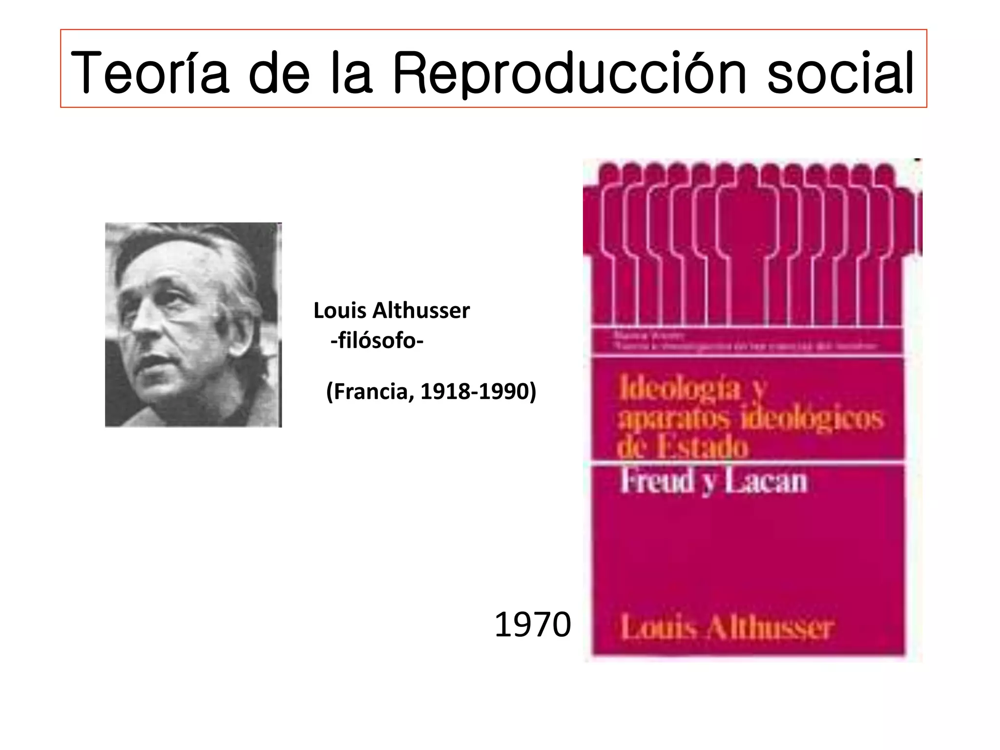 Althusser analiza cómo se reproduce la ideología dominante en la sociedad capitalista. Sostiene que la escuela cumple un rol fundamental como aparato ideológico del Estado al transmitir de forma encubierta la ideología de la clase dominante a los estudiantes. Aunque el capitalismo presenta a la escuela como neutral e ideológicamente vacía, en realidad su objetivo último es reproducir las relaciones de producción mediante la inculcación de la ideología dominante.