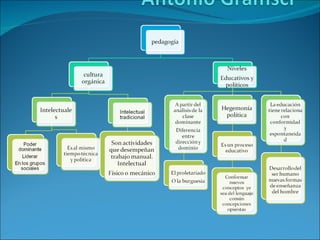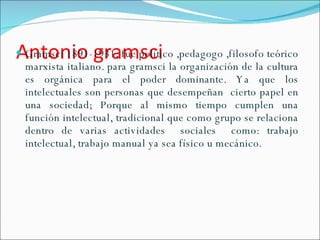 El resumen describe las teorías de Antonio Gramsci y Louis Althusser sobre la ideología y los aparatos ideológicos del estado. Gramsci argumenta que la organización de la cultura es orgánica para el poder dominante y que los intelectuales juegan un papel importante en dirigir a la sociedad a través de la educación. Althusser sostiene que la ideología se reproduce a través de los aparatos ideológicos del estado como la escuela y la familia, y que la escuela en particular enseña roles que reproducen las relaciones de