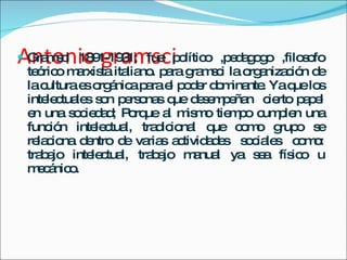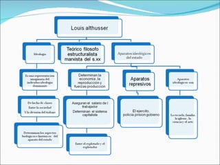 El resumen describe las teorías de Antonio Gramsci y Louis Althusser sobre la ideología y los aparatos ideológicos del estado. Gramsci argumenta que la organización de la cultura es orgánica para el poder dominante y que los intelectuales juegan un papel importante en dirigir a la sociedad a través de la educación. Althusser sostiene que la ideología se reproduce a través de los aparatos ideológicos del estado como la escuela y la familia, y que la escuela en particular enseña roles que reproducen las relaciones de