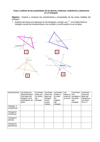 El documento analiza las propiedades de las alturas, medianas, mediatrices y bisectrices en un triángulo. Explica cómo estas líneas se relacionan con los vértices, lados y ángulos del triángulo, y analiza puntos notables como el incentro, baricentro, ortocentro y circuncentro. Finalmente, propone problemas para que los estudiantes apliquen estos conceptos.