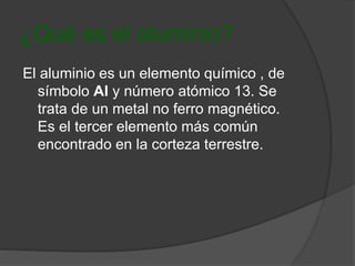 El aluminio es un metal no ferro magnético que se encuentra abundantemente en la corteza terrestre. Fue descubierto en 1825 por Oersted, quien obtuvo aluminio impuro al hacer reaccionar amalgama de potasio con cloruro de aluminio. Se usa comúnmente en la fabricación de aviones, espejos y aberturas debido a su resistencia y bajo peso.