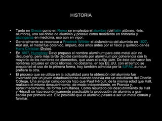 El aluminio es el metal más abundante en la corteza terrestre. Aunque es difícil de obtener en su forma pura, su ligereza y otras propiedades lo hacen útil para muchas aplicaciones, especialmente en la industria aeronáutica. Se obtiene principalmente a partir de la bauxita mediante electrólisis y se usa comúnmente en aleaciones, envases y construcción.