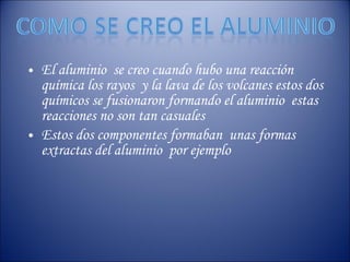 El aluminio es el elemento metálico más abundante en la corteza terrestre. Fue aislado por primera vez en 1825 por el químico danés Hans Christian Oersted mediante un proceso químico. Posteriormente, en 1827-1845, el químico alemán Friedrich Wöhler mejoró el proceso utilizando potasio metálico y cloruro de aluminio. En 1854, Henri Sainte-Claire Deville obtuvo el aluminio puro reduciendo cloruro de aluminio con sodio.