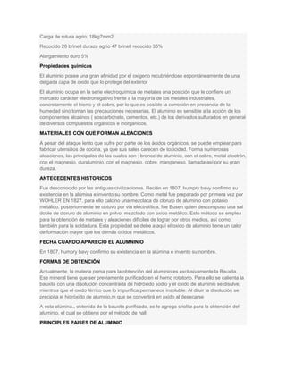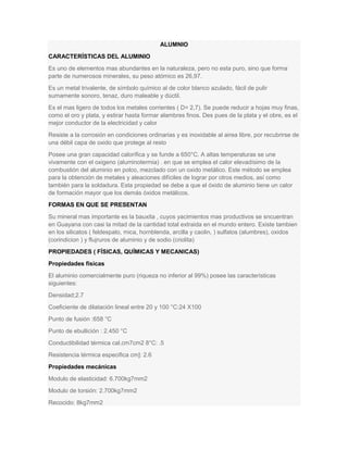 El aluminio es un metal ligero y abundante con una densidad de 2.7, que se oxida formando una capa protectora. Es resistente a la corrosión, buen conductor de la electricidad y el calor, y se puede fundir y moldear fácilmente. Forma aleaciones con otros metales para mejorar sus propiedades mecánicas y se usa ampliamente en la construcción, transporte y envases.