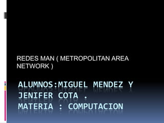 Una red MAN (Metropolitan Area Network) es una red de alta velocidad que cubre un área geográfica extensa y proporciona servicios de datos, voz y video a través de fibra óptica y par trenzado. Las redes MAN ofrecen velocidades entre 10Mbps y 10Gbps dependiendo del medio de transmisión. Sus características incluyen nodos equivalentes a subredes DQDB que se interconectan automáticamente, transporte orientado a conexión, no conexión e isócrono, y la capacidad de reconfigurarse