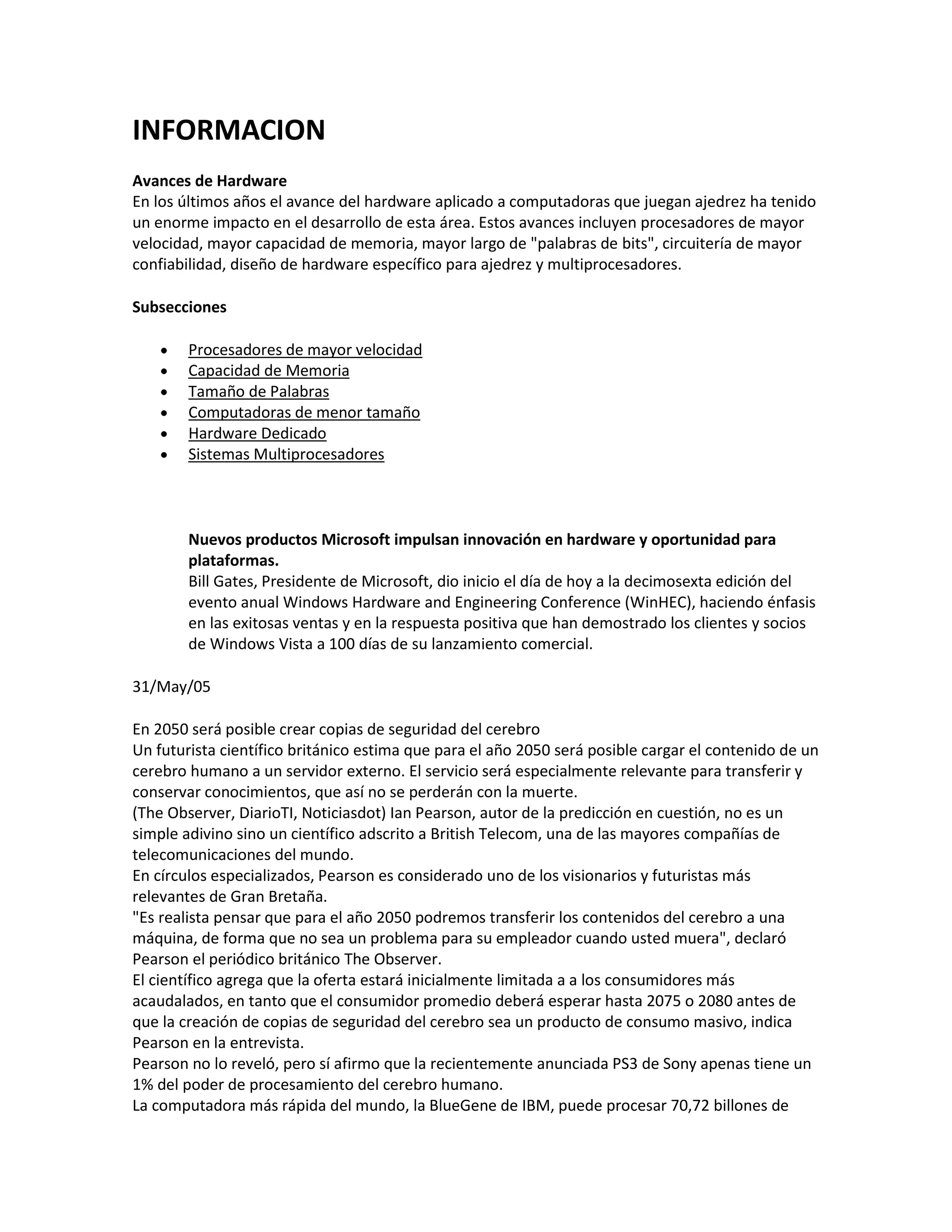 El documento describe varios avances recientes en hardware para computadoras, incluyendo procesadores más rápidos, mayor capacidad de memoria, hardware dedicado para ajedrez y sistemas multiprocesadores. También habla sobre predicciones de que para 2050 será posible crear copias de seguridad del cerebro humano y transferir la conciencia a máquinas, lo que permitiría preservar los conocimientos de una persona después de su muerte. Finalmente, menciona el lanzamiento de un nuevo producto de Microsoft llamado SCPD50, que es una computadora del t