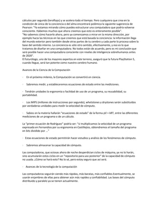 El documento describe varios avances recientes en hardware para computadoras, incluyendo procesadores más rápidos, mayor capacidad de memoria, hardware dedicado para ajedrez y sistemas multiprocesadores. También menciona que para 2050 será posible crear copias de seguridad del cerebro humano y cargar su contenido en un servidor, y que las computadoras del futuro podrán interactuar de forma más natural con los humanos.