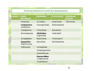 El documento resume los principales grupos de antibióticos utilizados en terapéutica antimicrobiana, incluyendo β-lactámicos, cefalosporinas, macrólidos, aminoglucósidos, quinolonas, nitroimidazoles y sulfamidas. Describe su mecanismo de acción, espectro de actividad y efectos adversos más comunes.