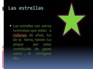 Las estrellas son astros luminosos compuestos de gases que están a millones de años luz de la Tierra. El Sol es una estrella que proporciona energía a la Tierra para sustentar la vida. El amor es una fuerza mágica que, cuando es correspondido, trae paz al mundo. La Luna es el único satélite de la Tierra y podría ser habitable en el futuro a pesar de su superficie hostil.