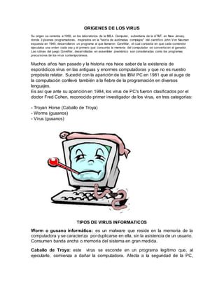 Un virus informático es un malware que altera el funcionamiento de un ordenador sin el permiso del usuario, propagándose a través de programas y causando daños como la pérdida de datos e interrupciones en los sistemas. Los virus se originaron en 1959 y han evolucionado para incluir gusanos, caballos de Troya y bombas lógicas. Instalar y mantener actualizado un programa antivirus puede ayudar a protegerse de los virus.