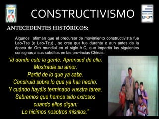 El documento presenta las teorías y antecedentes históricos del constructivismo como enfoque pedagógico. Describe las teorías de Piaget, Vygotsky, Bruner y Ausubel sobre el aprendizaje, así como los principios del constructivismo como concepción filosófica, psicológica y social del aprendizaje. Explica que el constructivismo propone que el conocimiento se construye a través de la experiencia y la interacción social.