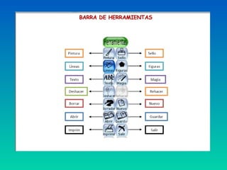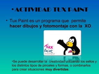 Tux Paint es un programa que permite crear dibujos y fotomontajes en la XO utilizando sellos, pinceles, formas y colores. Se puede escribir sobre los dibujos con diferentes tipos y colores de letra. El programa es fácil de usar y ofrece un espacio para dibujar, una barra de herramientas y una barra de colores.