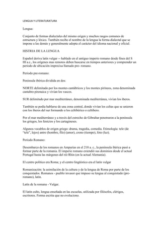 El documento habla sobre la historia y evolución del idioma español. Comienza explicando que el español deriva del latín vulgar hablado en el imperio romano. Luego describe los periodos pre-romano, romano, germánico y árabe, y cómo cada uno influyó en la formación del idioma. Finalmente, explica cómo el castellano se expandió y enriqueció al ser llevado a América tras la conquista.