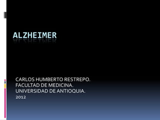 El documento define la enfermedad de Alzheimer como una enfermedad neurodegenerativa que causa pérdida de memoria debido a la muerte de neuronas y acumulación de proteínas tau y beta amiloidea. Fue estudiada por Alois Alzheimer y Emil Kraepelin a principios del siglo XX. Sus causas no son completamente conocidas pero se relacionan con factores como la edad, herencia y toxinas. Los tratamientos actuales incluyen medicamentos que detienen la muerte neuronal y mejoran la irrigación cerebral.