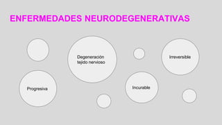 Las enfermedades neurodegenerativas como el Alzheimer son progresivas, irreversibles e incurables y causan la degeneración del tejido nervioso. No existe una cura para estas enfermedades, pero la estimulación cognitiva puede ralentizar el deterioro. Las causas incluyen factores genéticos y ambientales. El Alzheimer es la forma más común de demencia y causa la muerte de neuronas y la pérdida de tejido cerebral con el tiempo.
