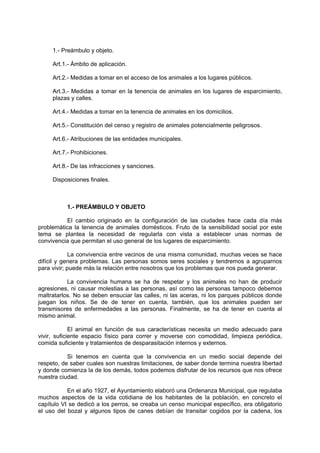 Este documento presenta una ordenanza municipal sobre la regulación de los animales de compañía en los lugares públicos y privados de la ciudad de Alzira. La ordenanza establece normas para el acceso de animales a lugares públicos, su tenencia en espacios de esparcimiento y viviendas, y la creación de un censo y registro de animales potencialmente peligrosos. El objetivo general es regular la convivencia entre personas y animales de compañía en la ciudad y proteger la salud y seguridad pública.