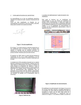 Este documento describe las diferentes etapas de un transmisor y receptor de AM, incluyendo un amplificador de micrófono, un modulador XR2206, un amplificador RF y un detector de picos. Explica cómo cada etapa procesa y transmite la señal de audio, la modula en una portadora de RF, amplifica la señal modulada y luego la demodula en el receptor para recuperar la señal de audio original.