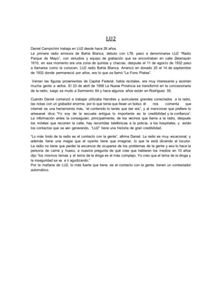 El documento detalla la historia de las radios en Bahía Blanca, enfocándose en LU2 y LU3, explorando su evolución, desafíos y el impacto de la tecnología en la radiodifusión. Se destaca la importancia de la credibilidad, el contacto humano y la vocación en el periodismo radiofónico, así como la transformación de las audiencias y la programación a lo largo del tiempo. También se menciona el papel de Radio Universidad y su desarrollo en un contexto de cambios sociales y tecnológicos.