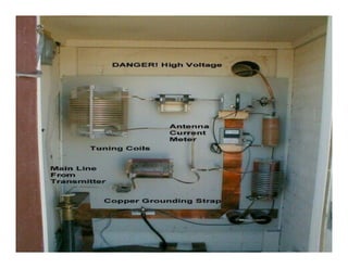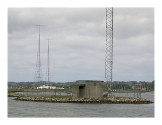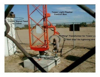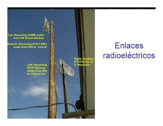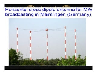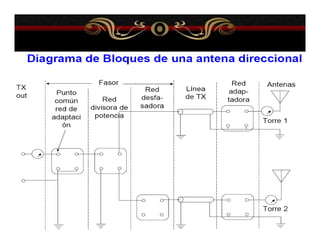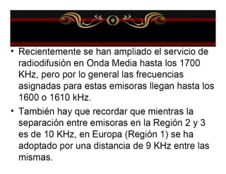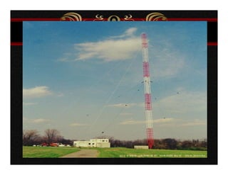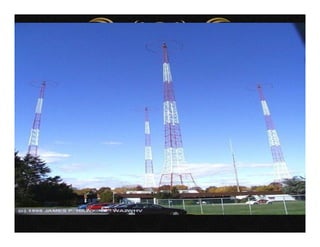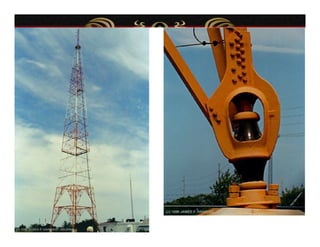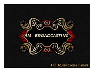 El documento describe varios aspectos de la transmisión de radio AM. Explica que la FCC ha asignado bandas de frecuencias para servicios como la telefonía celular y comunicaciones personales. También describe antenas omnidireccionales de AM, sistemas de protección contra radiaciones de radiofrecuencia, diplexores y sistemas de protección contra rayos para torres de transmisión. Por último, presenta un sistema portátil de transmisión AM para mantener la continuidad de emisiones ante eventos catastróficos.