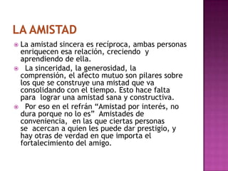 Este documento describe las características de una verdadera amistad. Una amistad sincera se basa en la reciprocidad, el enriquecimiento mutuo y el aprendizaje entre ambas personas. Los pilares de una amistad sana incluyen la sinceridad, la generosidad, la comprensión y el afecto mutuo. Un verdadero amigo no es solo alguien conocido desde la infancia, sino aquel con quien te identificas y disfrutas pasar tiempo, especialmente cuando otros se han ido.