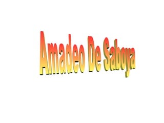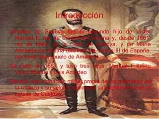 Amadeo de Saboya fue elegido como el primer rey de España en un parlamento en 1869 tras la revolución de 1868 que derrocó a Isabel II. Reinó hasta 1873 cuando abdicó y regresó a Italia, donde asumió el título de Duque de Aosta. Tras su reinado en España se proclamó la Primera República.