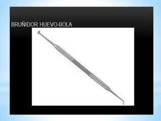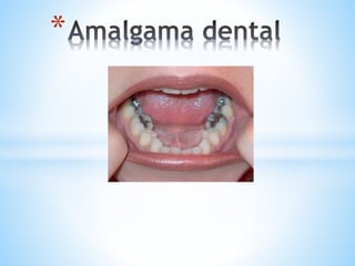 La amalgama dental es una aleación que combina mercurio con partículas sólidas de plata, estaño, cobre y a veces zinc. Se han usado desde 1819 y la composición actual data de 1895. Son indicadas para restauraciones posteriores debido a su alta resistencia, aunque su uso se limita a reemplazar tejido dental. Su colocación requiere protocolos para evitar contaminación por mercurio.