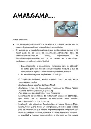 El documento proporciona información sobre el término "amalgama", explicando que puede referirse a una mezcla de cosas o personas, o específicamente a una aleación de mercurio con otros metales. Describe los usos principales de la amalgama en odontología, como material de restauración dental compuesto principalmente de plata, estaño, cobre y zinc. También explica los pasos para la conformación de las aleaciones de amalgama dental y su función para obturar cavidades y restaurar la función masticatoria.