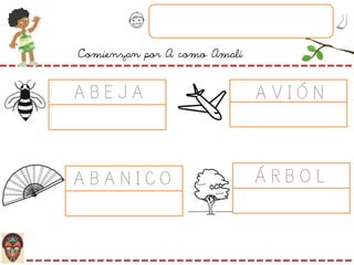 El documento presenta actividades realizadas por un niño para aprender el nombre de su nueva amiga Amalí. El niño dibuja objetos que comienzan con la letra A, como abeja y avión. Luego repasa la letra A del nombre Amalí y realiza actividades como contar, escribir y pegar gomitas. Finalmente, el niño observa, repasa y copia el nombre Amalí para aprenderlo.