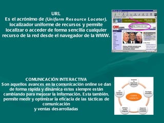 El documento habla sobre varios conceptos relacionados con la comunicación digital e Internet. Define URLs, comunicación interactiva, anclas en la web, ciberperiodismo, contenido web, páginas web, sitios web, portales de Internet, multimedia, hipertexto, blogs, chat, videoconferencia, periodismo digital, redes sociales, wikis, podcasts, TIC e infografía digital.