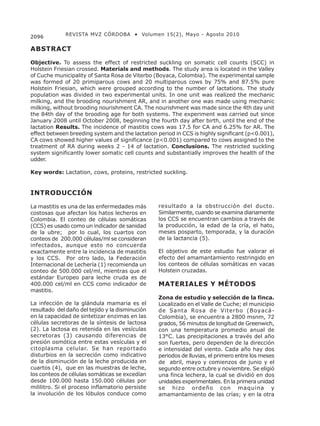 Este estudio evaluó el efecto del amamantamiento restringido en los conteos de células somáticas (CCS) en vacas Holstein cruzadas. Se dividió la población en dos grupos: uno con amamantamiento restringido de las crías y otro sin amamantamiento. El amamantamiento restringido redujo significativamente los CCS durante las primeras 14 semanas de lactancia. Las vacas multíparas y aquellas con mayor porcentaje genético Holstein tuvieron menores CCS. La temporada de nacimiento y la posición del cu