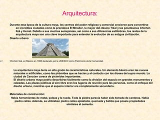 La cultura maya desarrolló una avanzada arquitectura, arte y escritura. Construyeron grandes ciudades como Tikal con impresionantes pirámides y plazas. Usaron materiales como piedra caliza y estuco, con estilos regionales que incluyen el Puuc. Crearon cerámica pintada, instrumentos musicales de viento y percusión, y esculturas de deidades como Kukulkán. También desarrollaron un complejo sistema de escritura que fue parcialmente descifrado en los siglos XIX y XX.