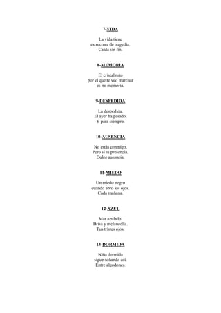 Este poema recopila 25 haikus que exploran temas como la soledad, la muerte, la ausencia y la fragilidad de la vida a través de imágenes como estrellas, abismos, almas, lobos, vampiros y calaveras. Cada haiku captura una imagen con pocas palabras y una estructura silábica precisa para transmitir sentimientos profundos sobre la condición humana en pocos versos.