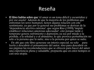 El resumen trata sobre el libro "Amar o Dependerr" de Walter Riso. En 3 oraciones: