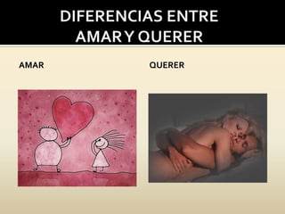 El documento explora las diferencias entre amar y querer, destacando que amar es más intenso y subjetivo, mientras que querer es menos intenso y está más relacionado con la satisfacción del presente. También señala que amar implica un desprendimiento incondicional, mientras que querer puede incluir un sentido de propiedad. Además, se menciona que el querer está más vinculado al tiempo presente, mientras que el amar se relaciona con anhelos y esperanzas futuras.