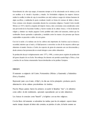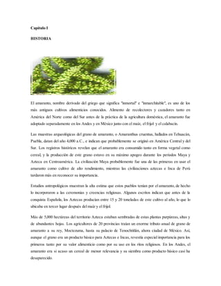 El documento describe la historia y origen del amaranto, uno de los cultivos alimenticios más antiguos conocidos. Originario de América, el amaranto fue un cultivo importante para las civilizaciones maya, azteca e inca. Los aztecas lo consideraban sagrado y lo usaban en rituales religiosos. Tras la conquista española, su cultivo fue prohibido y cayó en el olvido, aunque se mantuvo en algunas regiones. Recientemente ha resurgido el interés por sus cualidades nutricionales.