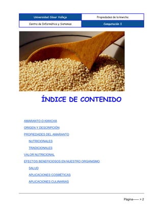 El documento describe las propiedades nutricionales y beneficios para la salud de la kiwicha. La kiwicha se ha cultivado en América por más de 7,000 años y es rica en proteínas, calcio, hierro y vitaminas. Provee numerosos beneficios como mejorar la salud ósea, reducir el colesterol, estimular el crecimiento y ayudar con problemas digestivos. También tiene aplicaciones cosméticas ya que su aceite ayuda a mantener la piel suave.