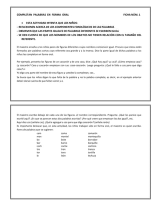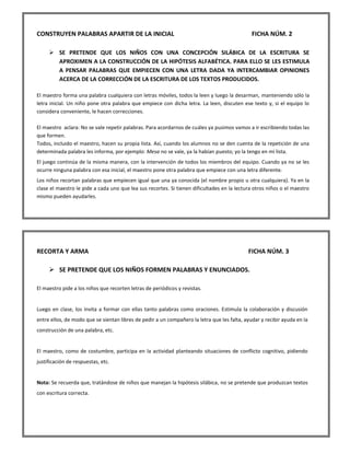 Este documento presenta 8 fichas con actividades para trabajar la conceptualización fonológica y ortográfica en niños. Las actividades incluyen completar palabras orales y escritas, construir palabras a partir de letras iniciales, recortar y armar palabras, y adivinar palabras ocultas cambiando el orden de sílabas. El objetivo general es que los niños reflexionen sobre los componentes fonológicos y ortográficos de las palabras.