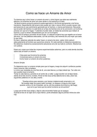 Este documento ofrece instrucciones para realizar un amarre de amor efectivo, incluyendo usar una foto de la persona, una vela blanca y lápiz labial rojo. Explica que los amarres atraen a alguien de forma permanente o temporal y que es importante acompañar el hechizo con seducción y trato afectuoso. Proporciona luego un amarre simple con tres pasos: encender la vela, escribir el nombre detrás de la foto y recitar una oración para amarrar a la persona.