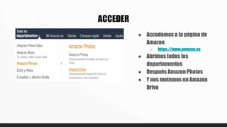 Este documento proporciona instrucciones para acceder y usar Amazon Cloud Drive. Explica cómo crear carpetas, subir archivos, compartir archivos mediante enlaces, mover archivos entre carpetas y ver el almacenamiento usado. También muestra cómo se ve la aplicación móvil de Amazon Drive y sus ajustes.