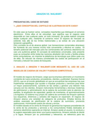 El documento analiza la competencia entre Amazon y Walmart en el comercio electrónico, destacando conceptos como ubicuidad y alcance global. Se examinan los modelos de negocio y la cadena de valor de ambas compañías, señalando que Amazon lidera al personalizar la experiencia de compra y anticipar necesidades del cliente, mientras que Walmart se beneficia de su red de distribución confiable. Además, se discuten factores de éxito como la planificación, el uso de datos, y la innovación en ambas empresas.