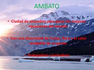 Ambato es una ciudad ecuatoriana conocida por su clima primaveral todo el año, ubicada a 128 km al sur de Quito y rodeada de volcanes y nevados. La ciudad tiene una temperatura promedio de 14.5°C y es conocida por su diversidad de frutas y flora así como la calidez de su gente. Los lunes se celebra una gran feria en Ambato donde se venden productos de toda la provincia y el país.