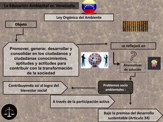 Este documento resume los artículos clave de la Ley Orgánica del Ambiente de Venezuela relacionados con la educación ambiental. La ley establece que la educación ambiental debe promover conocimientos y actitudes para contribuir a la transformación social hacia el desarrollo sustentable, abordando problemas como ética, derechos humanos y sustentabilidad. Los lineamientos incluyen incorporar una asignatura ambiental obligatoria, vincular el ambiente con temas como salud y economía, e involucrar a instituciones públicas y privadas en la capacitación en