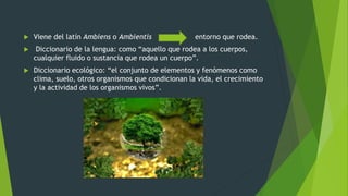 El documento define el ambiente como todo lo que nos rodea, incluyendo elementos naturales y sociales que interactúan y son necesarios para el desarrollo de la vida. Se clasifica el ambiente en natural, que incluye los terrestres, acuáticos y aéreos, y artificial, que son modificados y desarrollados por los humanos. El deterioro del ambiente ha ido empeorando con el tiempo debido a cambios tanto naturales como, principalmente, aquellos realizados por los seres humanos.