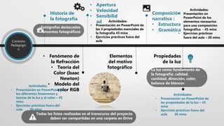 El documento detalla un plan de aprendizaje en fotografía básica para estudiantes de grado 9, enfatizando teorías de la luz, composición y propiedades fotográficas. Incluye actividades prácticas al aire libre y el uso de herramientas digitales, como Google Drive, para compartir trabajos y crear un álbum digital. El enfoque está en promover el aprendizaje significativo a través de la aplicación de tecnología y la interacción activa de los estudiantes.
