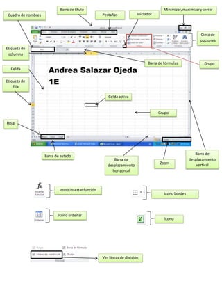 Este documento describe las partes principales de una hoja de cálculo de Excel. Identifica elementos como la barra de título, cinta de opciones, celda activa, hoja, barra de fórmulas, barra de estado y barras de desplazamiento vertical y horizontal. También menciona celdas, pestañas, minimizar, maximizar y cerrar, zoom y cuadro de nombres.