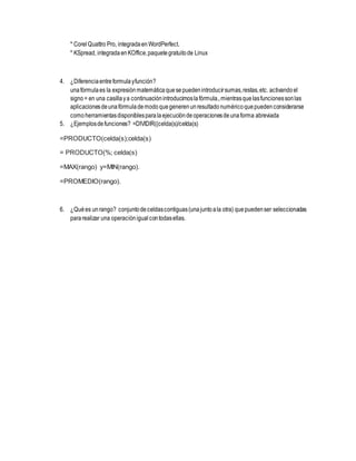 Este documento proporciona información sobre hojas de cálculo. Define una hoja de cálculo como un tipo de documento que permite manipular datos numéricos y alfanuméricos dispuestos en forma de tablas compuestas por celdas. Explica que hay diferentes hojas de cálculo en el mercado como Excel, Calc, Numbers y Gnumeric. Distingue entre fórmulas, que son expresiones matemáticas, y funciones, que son herramientas que generan resultados numéricos de forma abreviada. Por último, define un rango como un conjunto de celdas